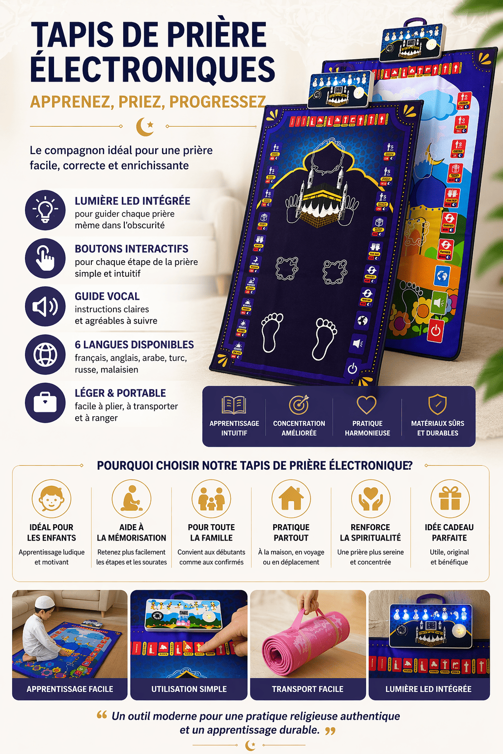 Ce tapis prière enfant interactif, éducatif et complet est conçu pour offrir une solution simple, efficace et accessible à tous.